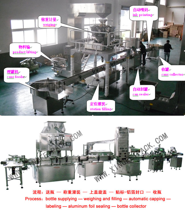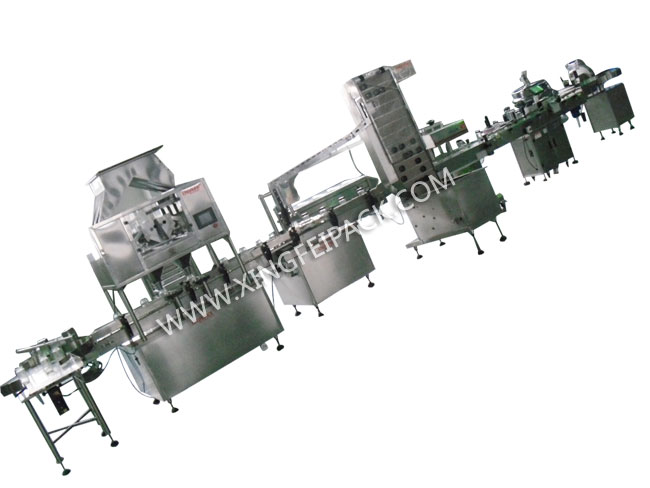 顆粒灌裝生產(chǎn)線用于顆粒物料的瓶裝和罐裝,瓶裝線包含供瓶-稱重灌裝-旋蓋 –貼標(biāo)-鋁箔封口-收瓶, 罐裝線包含,供瓶-稱重灌裝-封罐-噴碼-收瓶, 具體可按照要求定制。